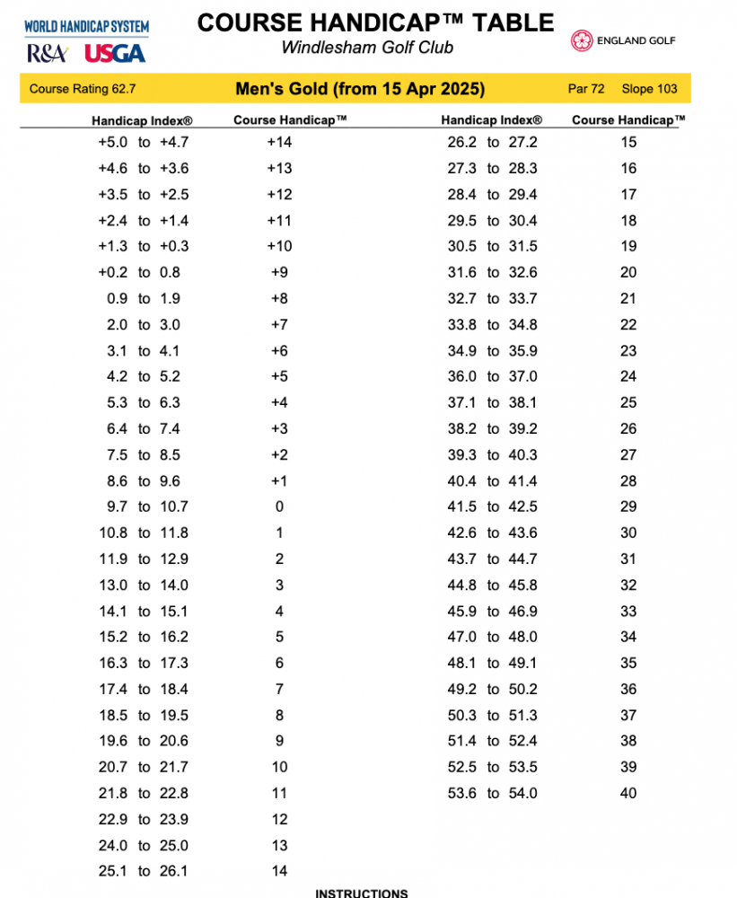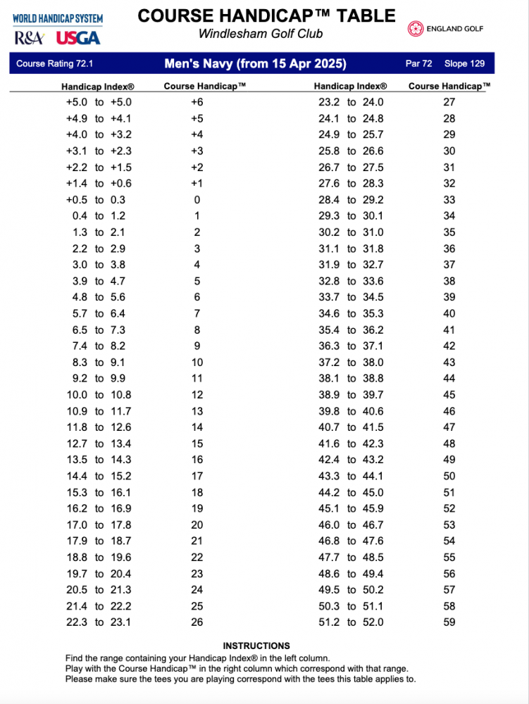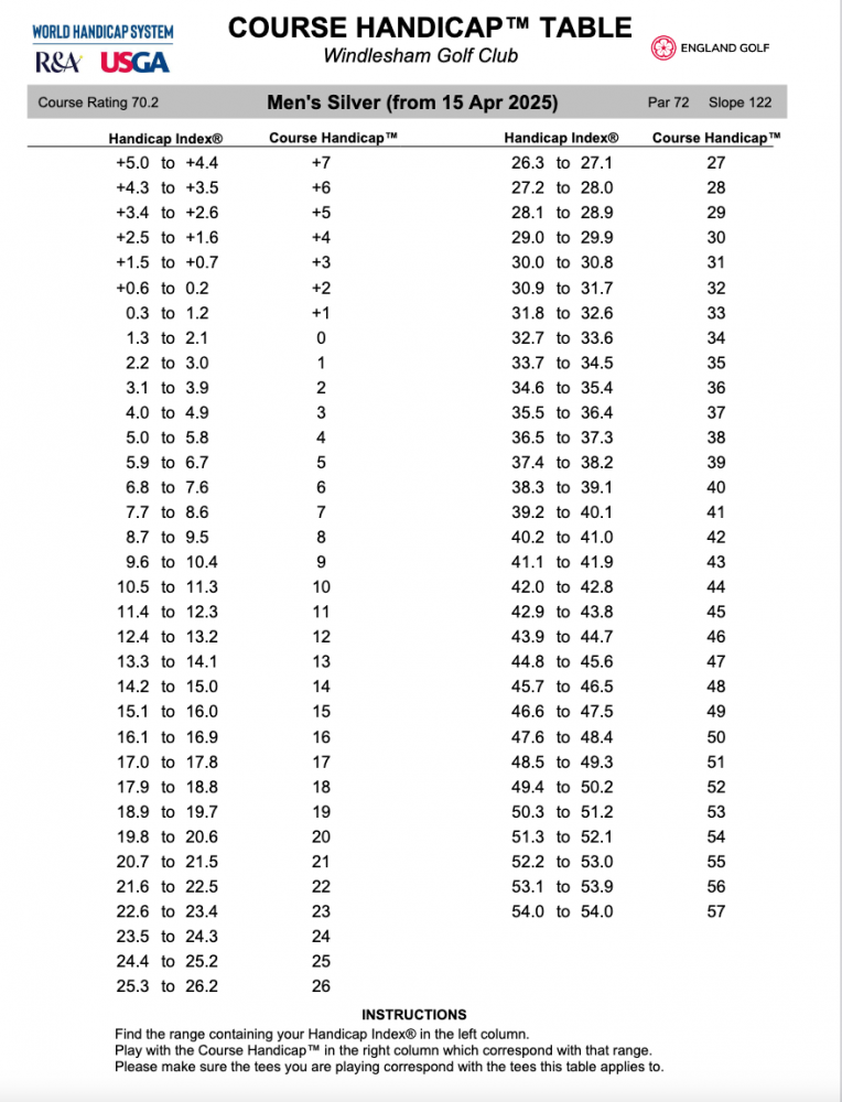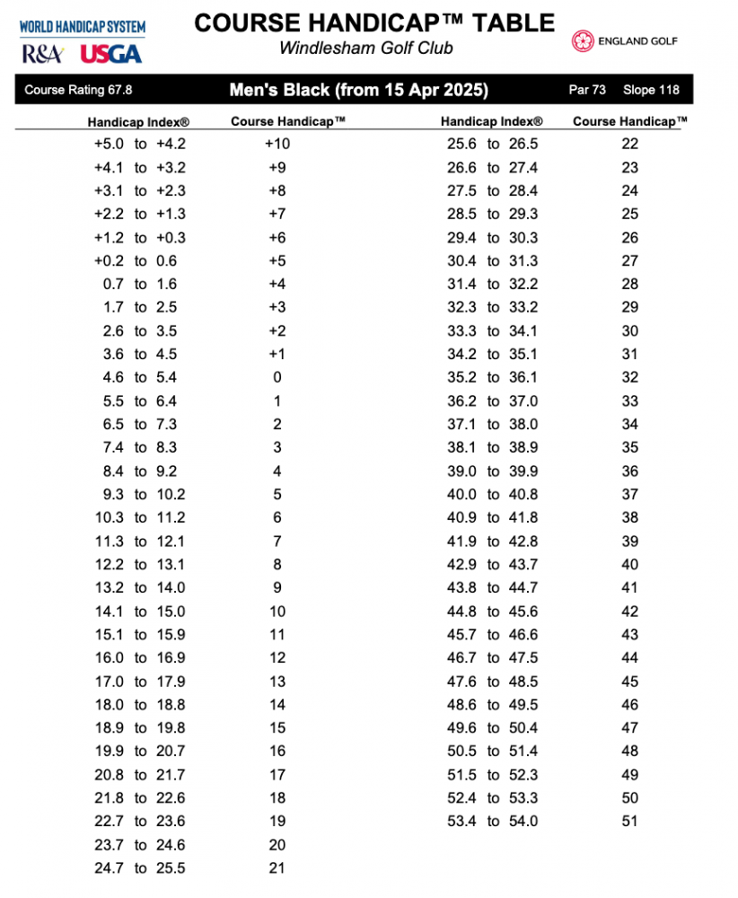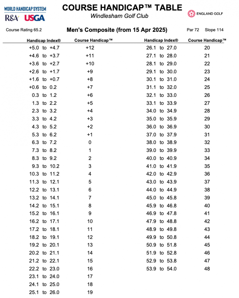 Please find the Course Handicap Tables for Windlesham Golf Club as at April 14th 2025
